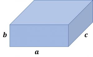 例).3辺の長さが\(a,b,c\)の直方体がある。この直方体の表面積と体積を求める。