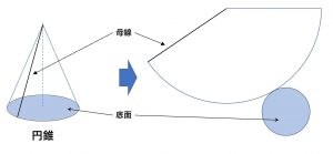 \(② 円錐の表面積=底面積+(母線を半径とする円の面積)\times \frac{底面の半径 \quad}{母線の長さ \quad}\)