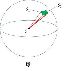 下記のように、球の中心\(O\)を頂点とした四角錘を考える。