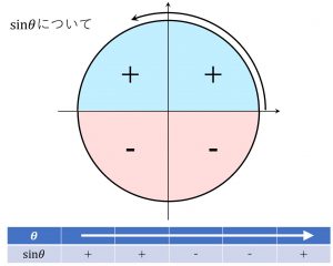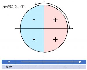 単位円と\(\theta と\cos\theta,\sin\theta\)の正負について