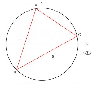 \(\triangle ABC\)の外接円の半径を\(R\)とすると、下記の公式が成り立つ。