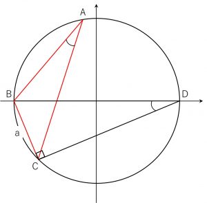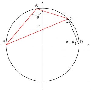 円周角の定理から、\(\angle BDC = \pi – A , \angle DCB = 90^{ \circ }\)であり、\(BD=2R\)となる。