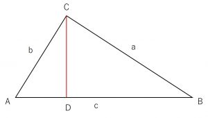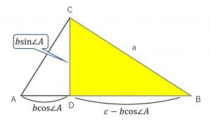 \(a^2=b^2+c^2-2bc\cos\angle A\) \(b^2=c^2+a^2-2ca\cos\angle B\) \(c^2=a^2+b^2-2ab\cos\angle C\)\(\triangle ABC\)について、点CからABに垂線を下ろし交わった点をDとする。