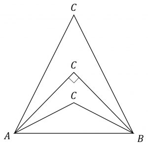 \(\angle C \lt 90^{\circ} \to a^2+b^2 \lt c^2\) \(\angle C = 90^{\circ} \to a^2+b^2 = c^2\) \(\angle C \gt 90^{\circ} \to a^2+b^2 \gt c^2\)