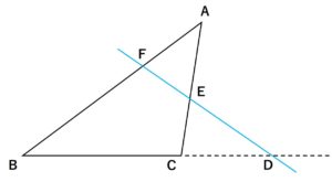 \(\large{\frac{BD}{DC}\cdot \frac{CE}{EA} \cdot \frac{AF}{FB}=1}\)となる。逆も成り立つ。