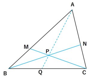 下記の図で\(AM:MB=2:1、\quad AN:NC=3:2、BNとCNとの交点をPとし、直線APと線分BCとの交点をQとする。\)