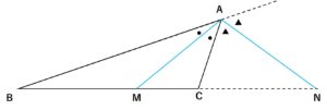 \(\triangle ABCで\angle A\)およびその外角の二等分線が直線AB上に交わる点をM、Nとすると
