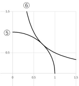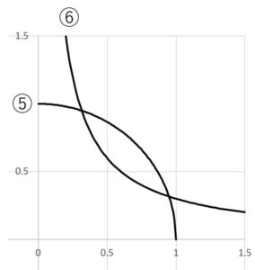 ⑤は円の式、⑥は反比例の式となり、これをグラフに表すと、